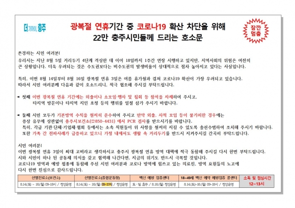 [충청뉴스큐] 충주시는 광복절 연휴 기간이 코로나19 확산 방지의 고비라 보고 광복절 연휴 기간 중 코로나19 확산 차단을 위해 시민분께 드리는 호소문을 배포했다.