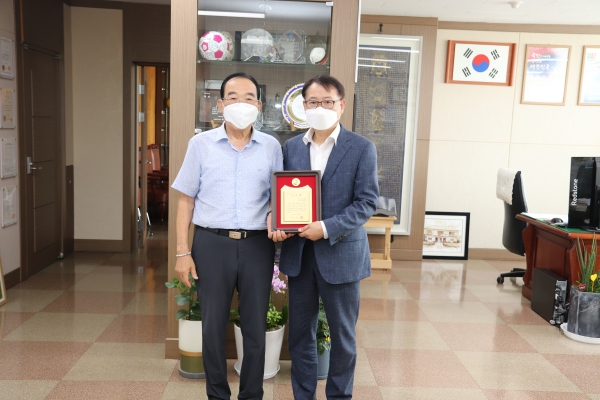[충청뉴스큐] 보은군립도서관은 푸른솔문인협회 강대식 회장이 1900여권의 도서 기중에 따른 감사패를 지난 13일 전달했다고 밝혔다.
