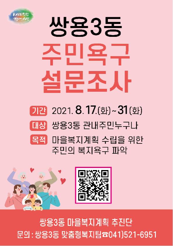 [충청뉴스큐] 천안시 쌍용3동 마을복지계획 추진단은 마을복지계획 수립을 위해 8월 17일부터 8월 31일까지 쌍용3동 주민을 대상으로 주민욕구조사를 실시한다고 밝혔다.