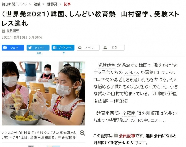 일본의 유력 일간지인 아사히 신문은 지난 8월 10일자 신문에서 ‘한국의 교육열’이라는 제목의 특집기사를 통해 전남농산어촌 유학프로그램을 소개했다.