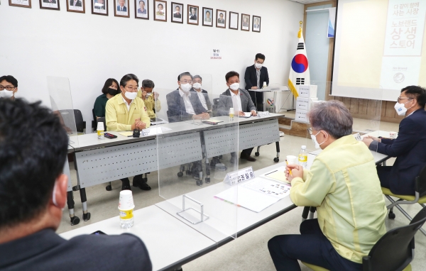 [충청뉴스큐] 중소벤처기업부 권칠승 장관은 지난 17일 당진전통시장을 찾아 상생의 현장인 ‘노브랜드’와 시장을 돌아보며 방역 상황을 점검했다.