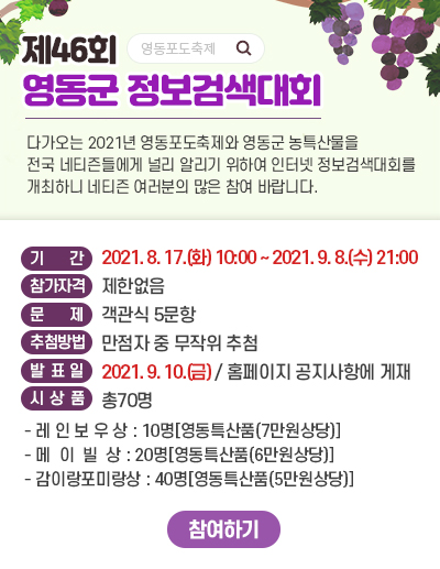 [충청뉴스큐] 충북 영동군은 영동포도축제 개최를 기념해 이달 17일부터 다음달 8일까지 군민과 전국 네티즌을 대상으로 ‘제46회 영동군 인터넷정보검색대회’를 개최한다고 밝혔다.