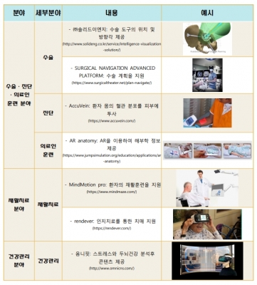 AR/VR 관련 출원은 환자의 재활치료에 관련된 출원이 가장 많은 것으로 조사됐다. 그 외 의료인 훈련에 관련된 출원, 수술, 건강관리, 진단 분야에 접목되는 등 AR/VR의 활용분야가 다양화되는 추세를 보이고 있다. 대표적으로 만성적인 의료인력 부족을 해결하기 위한 인력 양성 과정에 활용될 수술·진단·의료인 훈련분야 고통스러운 재활 과정에 활용하여 질환의 회복을 돕는 재활치료분야 환자 삶의 질을 향상시킬 건강관리분야에 활용되고 있다. 또한 만성질환의 증가, 인구 고령화 및 전문 인력 부족과 같은 문제를 해결하고 더 효율적인 서비스를 위한 AR/VR활용이 확대되는 추세다.