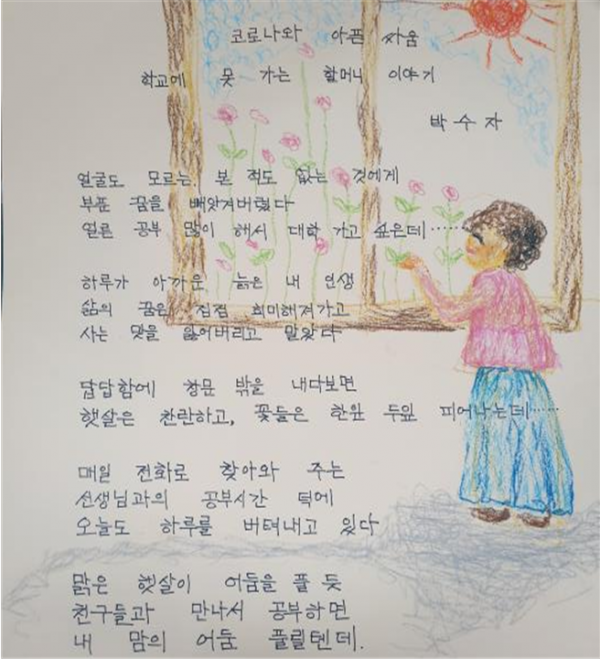 이번에 최우수상을 수상한 작품은 ‘코로나와 아픈 싸움’이라는 제목으로 초등학력을 이수하고 중학학력인정 과정을 이어가는 과정에 코로나로 인해 수업을 제대로 이어가지 못하는 어려움과 답답함을 토로한 작품이다.