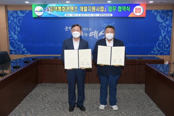 이번 협약은 충남정보문화산업진흥원 공모사업인 2021 지역특화콘텐츠 개발지원사업에 윤봉길 의사가 선정됨에 따른 것으로 총 사업비 2억2300만원을 투자하는 사업이다.