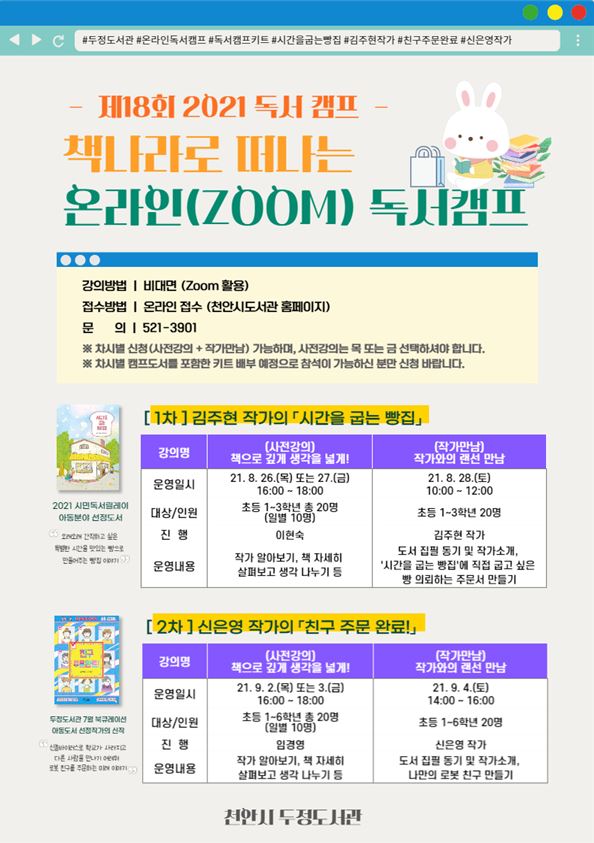 1차는 시민독서릴레이 아동분야 올해의 책으로 선정된 김주현 작가의 ‘시간을 굽는 빵집’, 2차는 두정도서관 7월 북큐레이션 아동도서로 선정된 신은정 작가의 ‘친구 주문 완료’를 다루며 사전강의를 통해 선정도서를 캠프참가자들이 함께 읽고 이야기를 나누는 시간을 마련하고 랜선을 통해 작가와 소통하는 시간으로 운영된다.