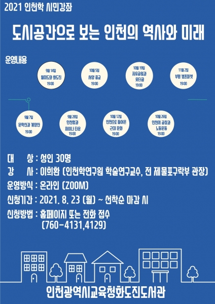 [충청뉴스큐] 인천광역시교육청화도진도서관은 지역 주민들을 대상으로 9월 7일부터 11월 2일까지 ‘도시공간으로 보는 인천의 역사와 미래’ 라는 2021 인천학 시민강좌를 운영한다.