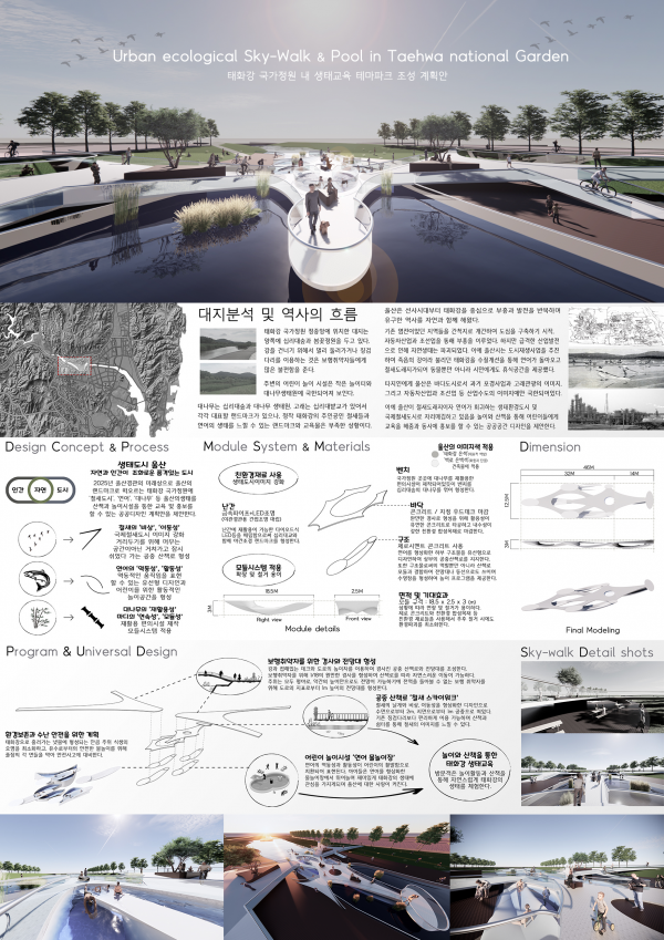 대상작인 ‘태화강 국가정원 내 생태교육 테마파크 조성 계획안’은 울산만의 정체성을 잘 나타내는 디자인으로 활용성, 공공성, 장소성, 창의성을 두루 갖춘 뛰어난 작품으로 평가받았다.