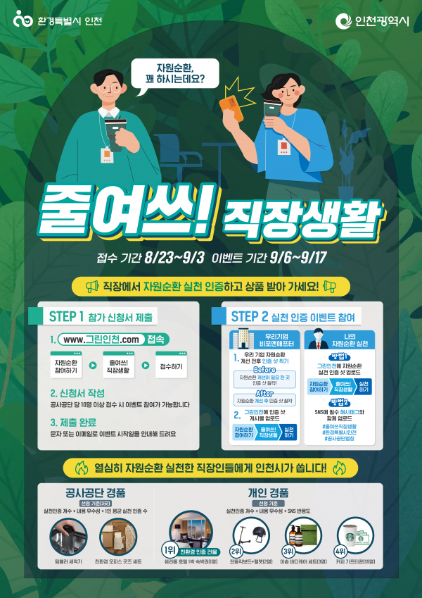 [충청뉴스큐] 인천광역시는 관내 기업을 대상으로 직장인 자원순환 실천 캠페인 ‘줄여쓰 직장생활’에 참여할 기업을 모집한다고 밝혔다.