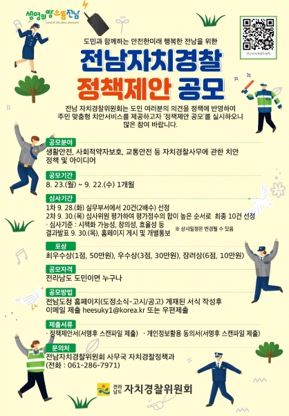 [충청뉴스큐] 전남자치경찰위원회가 도민 의견을 반영한 지역 맞춤형 치안서비스를 위해 9월 22일까지 1개월간 ‘전남자치경찰 정책 제안’을 공모한다.