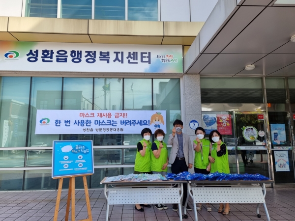 [충청뉴스큐] 천안시 성환읍 방문형공동대응팀이 지난 24일 행정복지센터를 이용하는 주민들에게 코로나19 예방을 위한 ‘마스크 재사용 STOP’ 홍보를 실시했다.