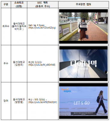 최우수상에는 ‘Hash tag#Busan’ 이, 우수상에는 ‘부산의 다,다,다!’ 장려상에는 ‘부산! 아따 직이네~’ 가 선정됐다.
