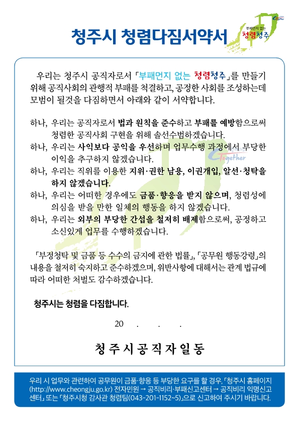 청렴다짐서약서는 부패먼지 없는 청렴청주를 만들기 위해 공직사회의 관행적 부패를 척결하고 공정한 사회를 조성하는데 모범이 될 것을 다짐하는 서약서이다.