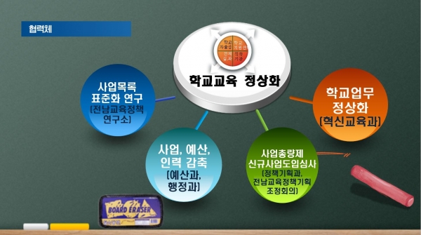 이에 도교육청은 전남교육정책연구소와 협업을 통해 ‘사업목록 표준화’연구를 진행하고 예산서상 사업 수준을 일관성 있게 정비한 결과 사업 총량이 1,759개임을 확인했다.