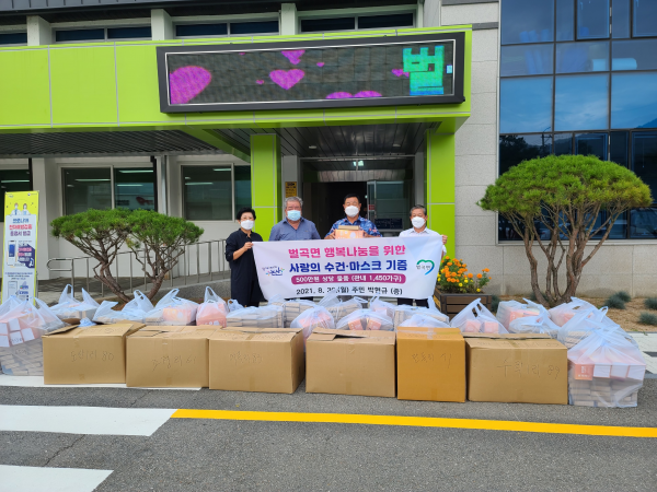 [충청뉴스큐] 논산시 벌곡면은 벌곡면에 거주하고 있는 주민 박현규씨가 코로나19장기화로 어려움을 겪고 있는 면민을 위해 5백만원 상당의 수건과 마스크를 기탁했다고 전했다.