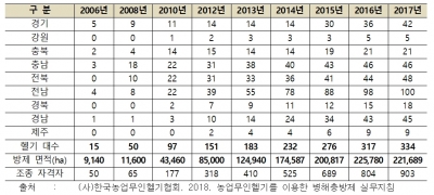 사단법인 한국농업무인헬기협회 자료에 따르면 농업용 무인 헬기는 2006년 15대에서 2017년 334대로 증가했고, 방제 면적도 2006년 9,140ha에서 20017년 22만 1,689ha로 크게 늘었다.