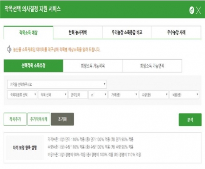 [충청뉴스큐] 농촌진흥청은 재배 작목 결정 등 중요한 의사 결정을 망설이는 농업인들을 위해 180여 가지 작목으로 얻을 수 있는 소득을 예측할 수 있는 '작목선택 의사결정 지원 프로그램'을 경기도농업기술원과 공동 개발했다.
