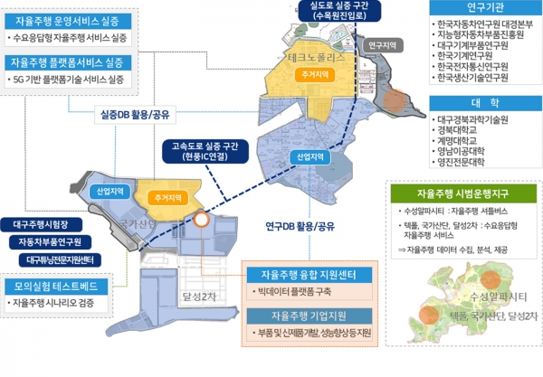 이와 함께 국내 최대 규모의 실도로 기반 실증환경을 조성하기 위해 수성알파시티, 테크노폴리스, 대구국가산단, 달성2차산업단지에 총 100㎞ 이상의 도로에 노변장치, 돌발상황 검지기, 기상관측장비 등을 설치한다.