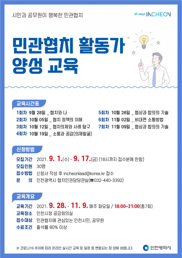 [충청뉴스큐] 인천광역시는 9월 28일부터 11월 9일까지 7주간 인천시청 공감회의실에서 ‘민관협치 활동가 양성교육’을 운영한다고 밝혔다.