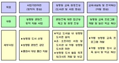 두 번째, ‘환경’ 중심 영역에서는 모든 아동이 성평등 콘텐츠를 쉽고 친근하게 접할 수 있는 환경을 조성하는데 초점을 두고 있다.
