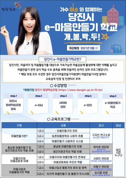 [충청뉴스큐] 당진시가 이번 달 1일 충남 최초로 당진시 e-마을만들기학교를 본격 개강해 운영한다고 밝혔다.