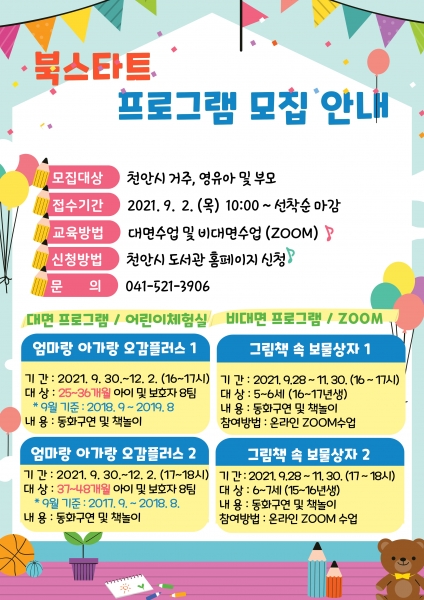 3세~7세 사이의 영유아를 대상으로 한 책놀이 프로그램을 대면·비대면으로 운영하며 접수기간은 9월 2일 오전 10시부터 선착순 마감으로 진행한다.