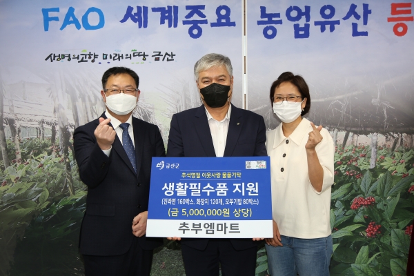 [충청뉴스큐] 금산 추부엠마트는 지난 9월 1일 추석 명절을 맞아 도움이필요한 이웃들에게 전달해 달라며 500만원 상당의 라면 160박스, 화장지 120팩, 즉석밥 80박스를 금산군에 기탁했다.