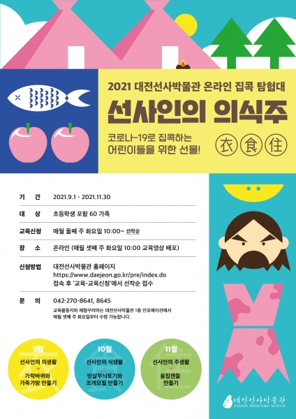 [충청뉴스큐] 대전선사박물관은 9월부터 11월까지 초등학생 동반 가족을 대상으로 온라인 교육 프로그램 2021년 대전선사박물관 집콕탐험대 ‘선사인의 의식주’를 운영한다.