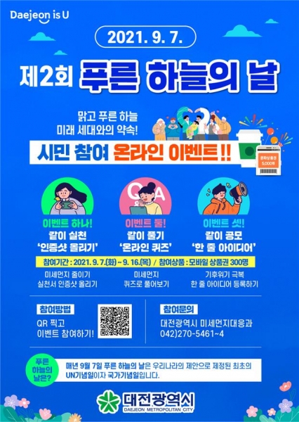 [충청뉴스큐] 대전시는‘제2회 푸른 하늘의 날’을 맞이해 9월 7일부터 9월 16일까지 10일간 시민참여 온라인 퀴즈 이벤트를 진행한다.