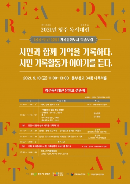 시 관계자는 “이번 학술포럼은 기록문화도시 청주의 기록문화를 같이 만들어갈 시민 기록활동가들과 함께하는 자리”며 “‘2021 청주독서대전’과 궤를 같이 해 열린다는 점에서 더욱 뜻깊다”고 말했다.