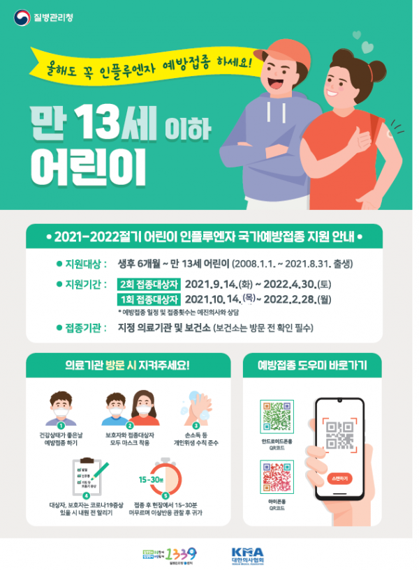[충청뉴스큐] 질병관리청은 9월 14일부터 순차적으로 생후 6개월~만 13세 어린이, 임신부 및 만 65세 이상 어르신에게 인플루엔자 4가 백신으로 무료접종을 시행할 계획이라고 밝혔다.