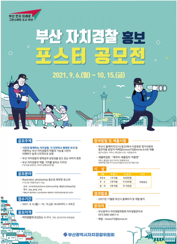 문봉균 부산시 자치경찰관리과장은 “이번 홍보 포스터 공모전을 통해 자치경찰제에 대한 인지도를 높이고 시민 공감대를 넓힐 수 있도록 시민들의 많은 관심과 적극적인 참여를 당부드린다”고 말했다.