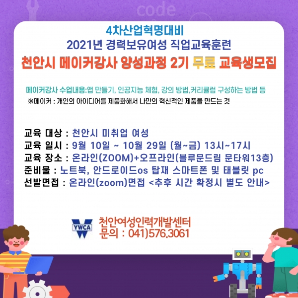 [충청뉴스큐] 천안시가 전문 교육기관인 천안여성인력개발센터와 4차 산업혁명시대 고부가가치 직종특화 교육과정인 ‘천안시 메이커 양성과정’ 2기 교육생을 모집한다.
