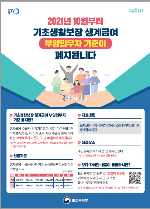‘기초생활보장제도 생계급여 부양의무자 기준 폐지’에 따른 상담 및 신청은 주소지 읍면동 행정복지센터에서 가능하며 관련 문의는 129 보건복지상담센터를 통해서도 안내받을 수 있다.