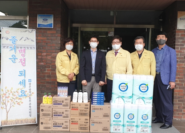 광주동부교육지원청은 복지시설을 운영하는 관계자에게 유아용 샴푸·치약 등 생필품을 전달하고 유아 및 학생들을 격려했다.
