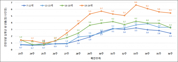 발생률이 가장 높은 연령층은 대학생 연령에 해당하는 19~24세였으며 다음은 중·고등학생 연령인 13세~18세이고 초등학생 연령대의 경우 가장 발생률이 낮았다.