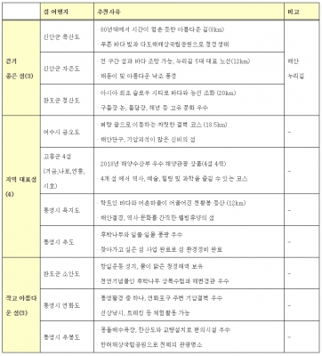 ‘10선’에는 해안누리길 노선이 있는 3개의 섬과 함께, 겨울철 상대적으로 따뜻한 전라남도와 경상남도의 섬 7개가 포함되어 있다.