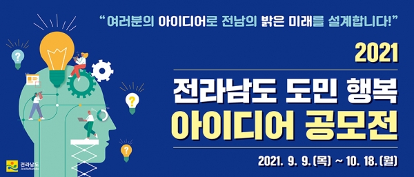 [충청뉴스큐] 전라남도는 도민과 함께 행복한 으뜸 전남을 설계할 ‘2021 도민 행복 아이디어 공모전’을 개최한다고 밝혔다.