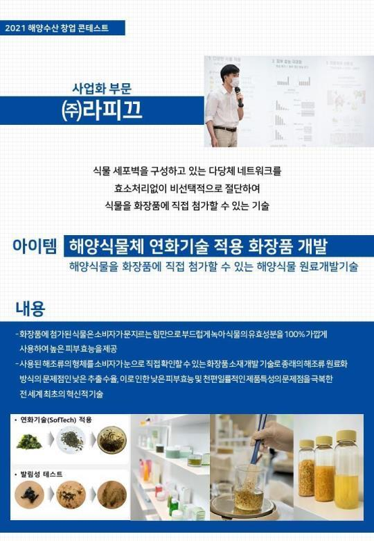 첫째, 사업화 부문 대상 수상팀 ‘라피끄’는 해양식물체 연화기술을 적용해 해양식물의 효용성분이 피부에 공급되는 수율을 획기적으로 높일 수 있는 화장품 개발 기술을 제안했다.