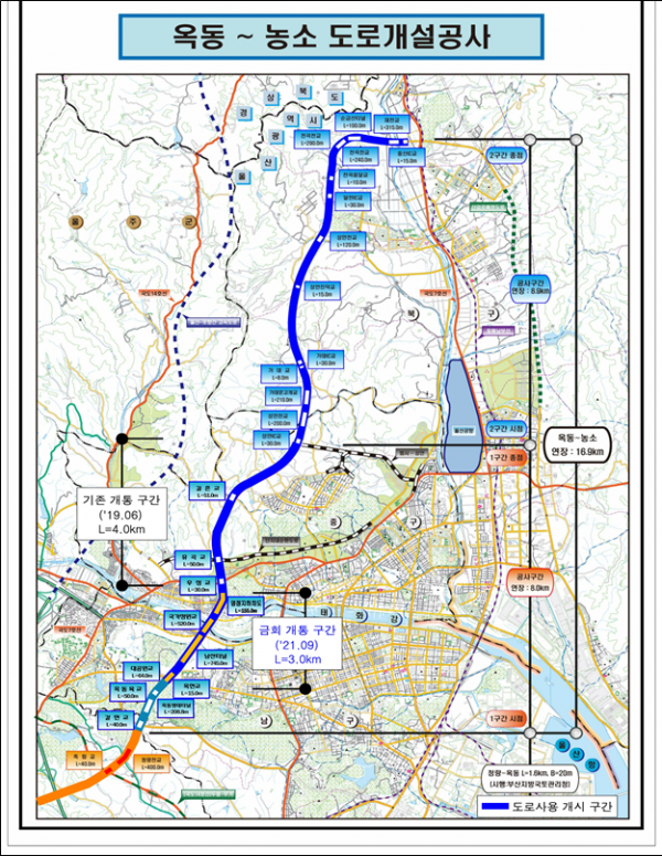 ‘옥동 농소1 도로개설공사’는 총사업비 2967억원이 투입되어 남구 옥동 갈티교차로에서 중구 성안동 성안나들목까지 연장 8㎞, 폭 20m 규모로 지난 2013년 1월 착공됐다.