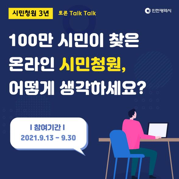 [충청뉴스큐] 인천광역시는 9월 13일부터 30일까지 온라인 정책담론장인 ‘토론 Talk Talk’의 여섯 번째 토론을 진행한다고 밝혔다.