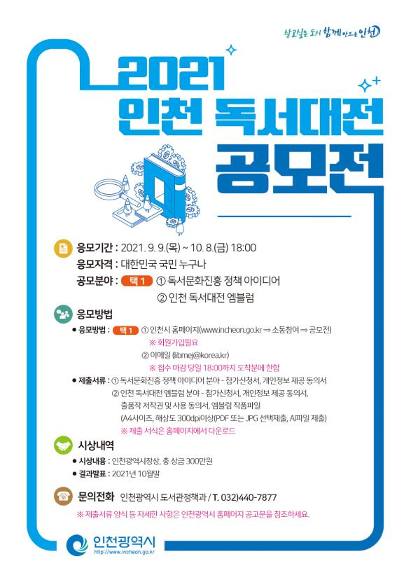 이번 공모전은 인천 독서문화의 발전과 ‘2021 인천 독서대전’에 직접 참여할 수 있는 기회를 제공하기 위해 마련됐다.