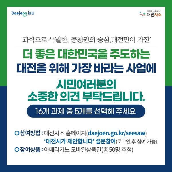 과제별 세부내용은 ‘대전시소’ 홈페이지를 통해 확인할 수 있으며 이달 24일까지 시민 누구나 설문에 참여할 수 있다.