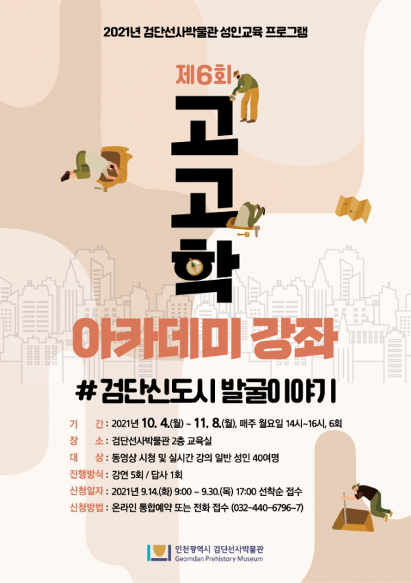 [충청뉴스큐] 인천광역시는 검단선사박물관에서 10월 4일부터 11월 8일까지 일반시민을 대상으로 고고학 아카데미 강좌를 개설한다고 밝혔다.