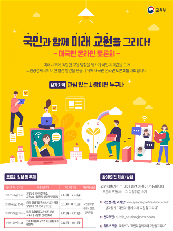 [충청뉴스큐] 교육부는 ‘교원양성체제 발전방안’ 수립을 위해 그간 진행한 주제별 대국민 토론회 결과를 바탕으로 오는 15일 오후 2시 40분에 온라인 공청회를 실시할 계획이라고 전했다.