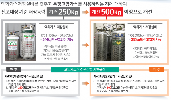 액화산소저장 기본 용기 저장능력은 1대당 168kg으로 대부분 중·소형 병원, 공장 등에는 사용 편의를 위해 저장 용기가 최소 2대가 필요하나 2대 보유 시 기존 신고대상 기준을 넘어 사용신고는 물론 교육, 관리 등 엄격한 기준에 따른 여러 제반 사항을 이행해야 했다.