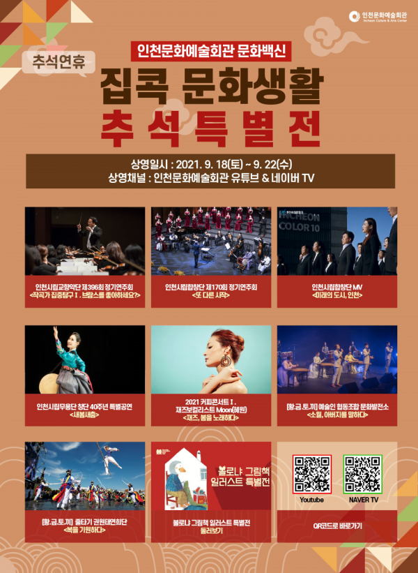 [충청뉴스큐] 인천시가 추석을 맞아 가족의 건강과 안전을 지키며 사회적 거리두기를 실천하는 시민들의 ‘슬기로운 집콕 문화생활’을 위해 다양한 장르의 공연, 전시 온라인 영상 콘텐츠를 제공한다.