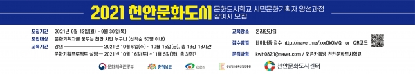 [충청뉴스큐] 천안시와 충남정보문화산업진흥원, 천안문화도시센터는 천안시민 문화기획자 양성과정 ‘2021 천안 문화도시학교’ 교육생을 오는 30일까지 모집한다.