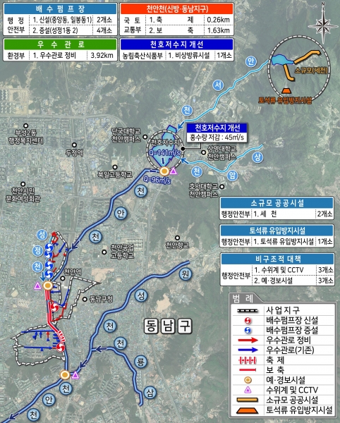천안천 풍수해생활권 종합정비사업은 479억원 사업비를 투입해 배수펌프장 신설 4개소 및 증설 2개소, 우수관로 정비, 축제와 보축, 천호저수지 개선 등을 추진한다.