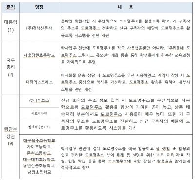 최우수상은 공공기관 건물의 특성을 살려 자율형건물번호판을 설치한 도봉구청이 선정되었고 기타 분야에서는 역사 인물을 탐구하고 답사활동을 통해 학생들의 지역사회 프로그램과 연계한 활용 사례가 선정되어 행정안전부 장관 표창과 부상으로 상품권 50만원을 받는다.